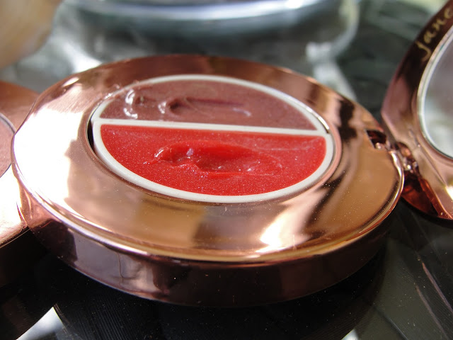 Both glosses apply very nice. They are not sticky and have no taste at all. One looks very natural with a hint of glitter and the other is more coral and if you layer it, it can be a real bright coral. I would not stick my finger into the pan to not get bacteria in there and always use a lip brush (I like this lip liner which has a great lip brush on one side) which makes it maybe a little more complicated "on the go" then I would like to.
